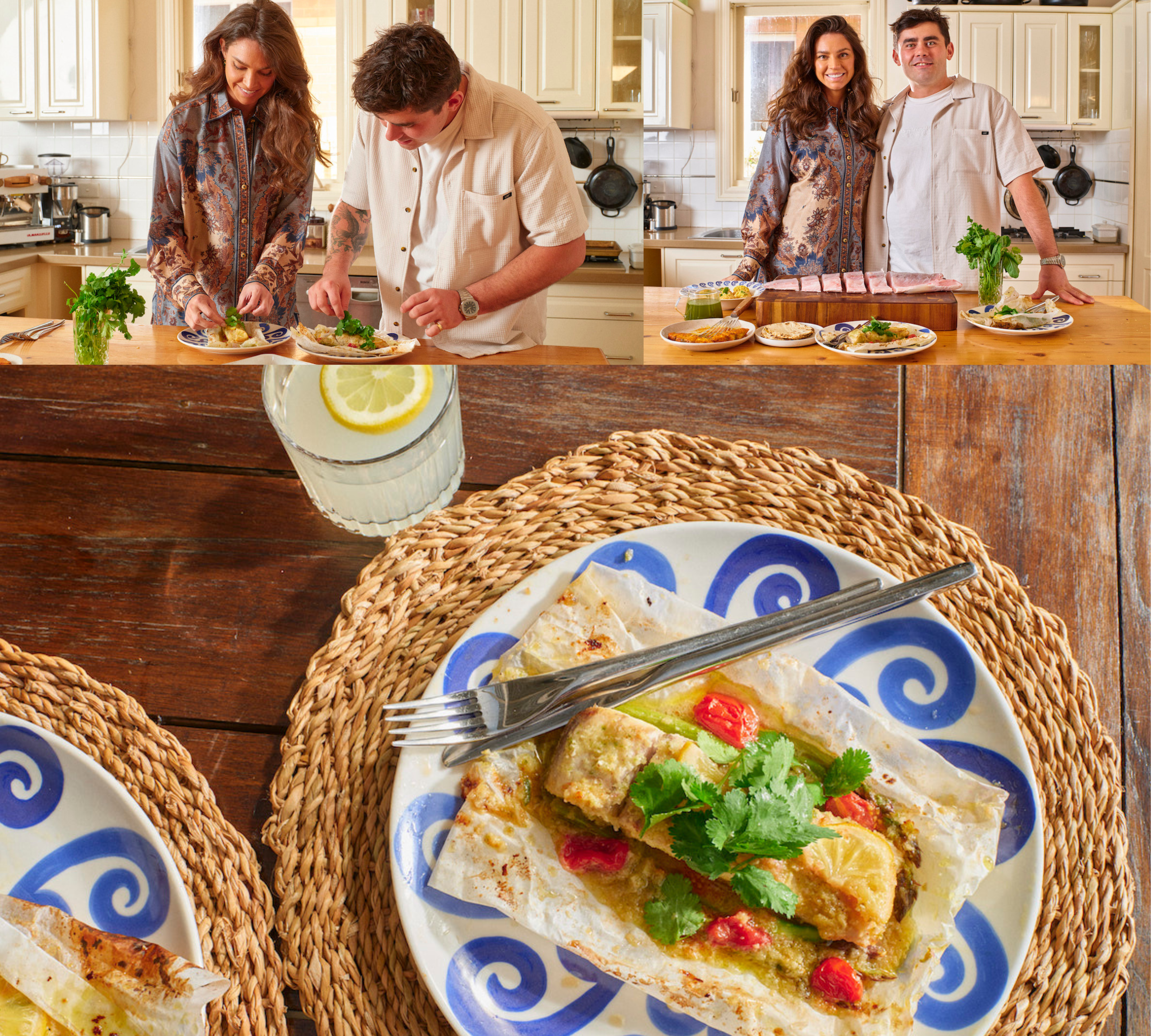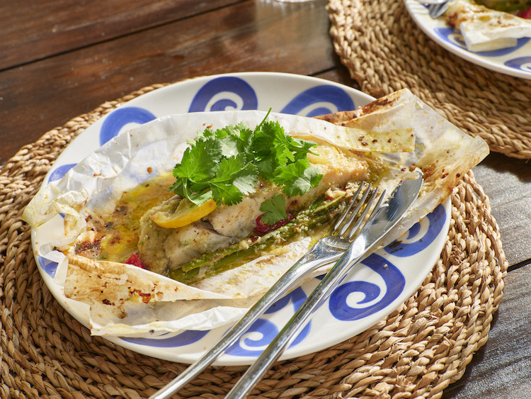- On a sheet of baking paper, layer asparagus and place marinated barramundi on top.ย